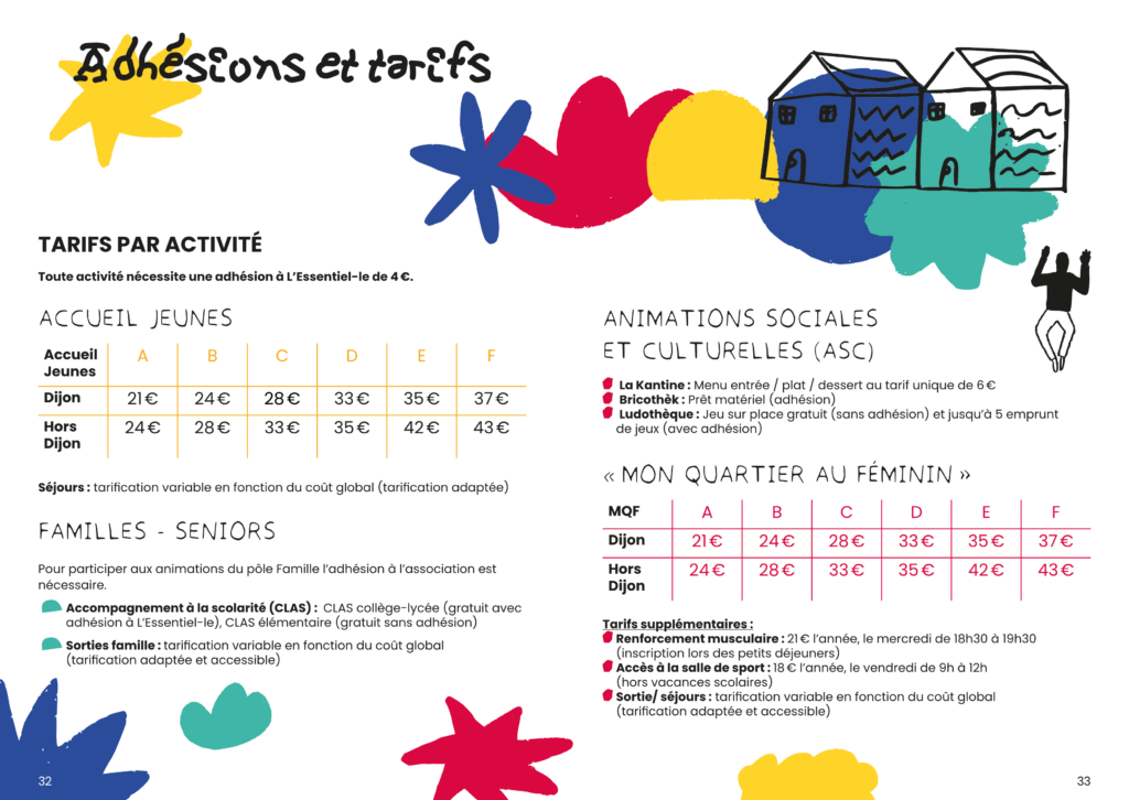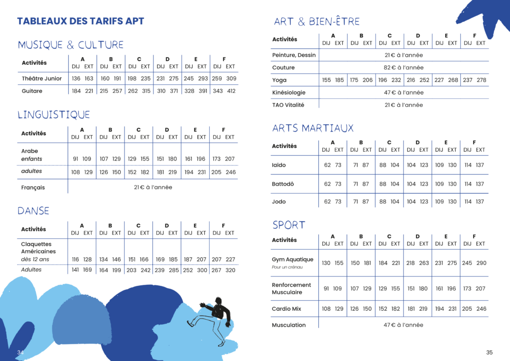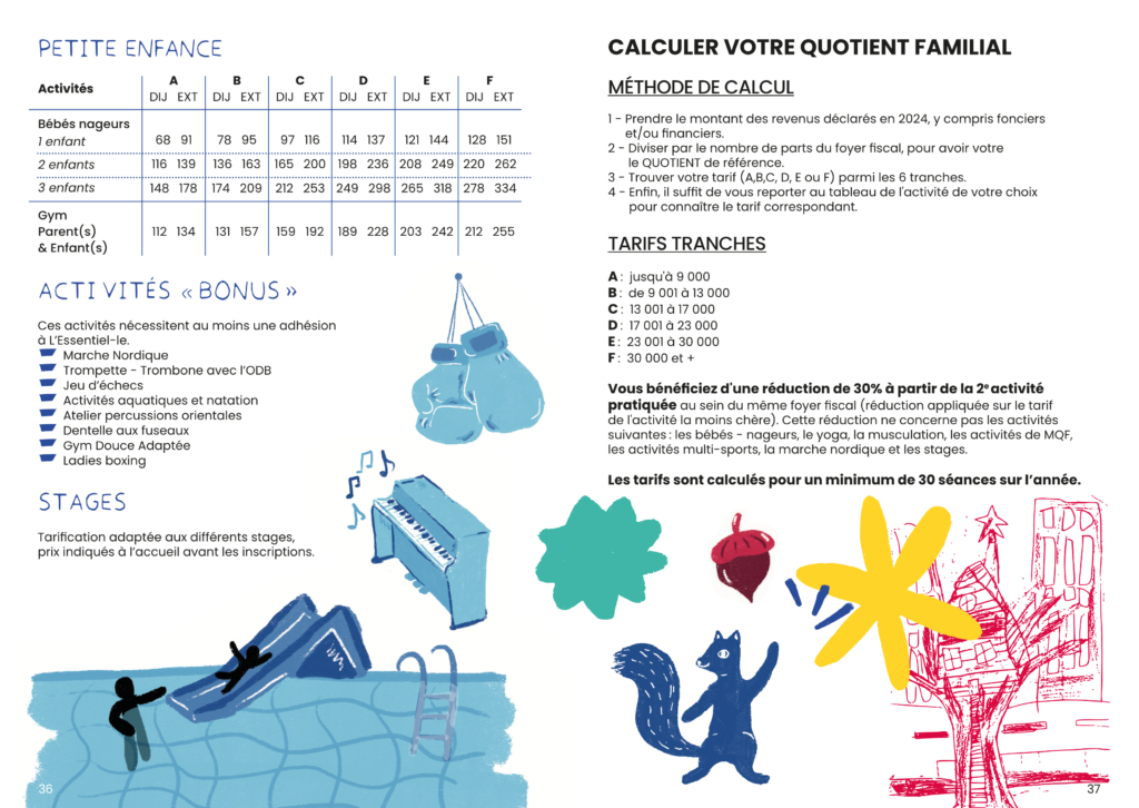 Vous bénéficiez d’une réduction de 30% à partir de la 2ème activité pratiquée au sein du même foyer fiscal (réduction appliquée sur le tarif de l’activité la moins chère). Cette réduction ne concerne pas les activités suivantes : les bébés – nageurs, le dessin/ peinture, le yoga, la musculation, les activités de Mon Quartier au Féminin, les activités multi-sports, la marche nordique et les stages.
