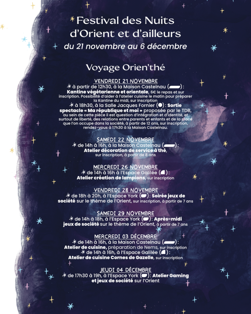 – Voyage Orien’thé (ateliers créatifs, de cuisine, jeux, etc.) ;
