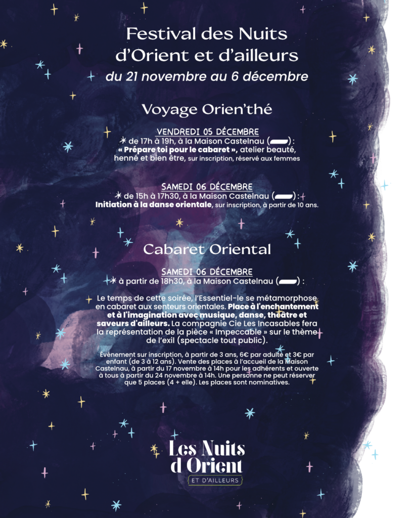 – Cabaret Oriental (théâtre, danse orientale, musique et saveurs d’ailleurs…).